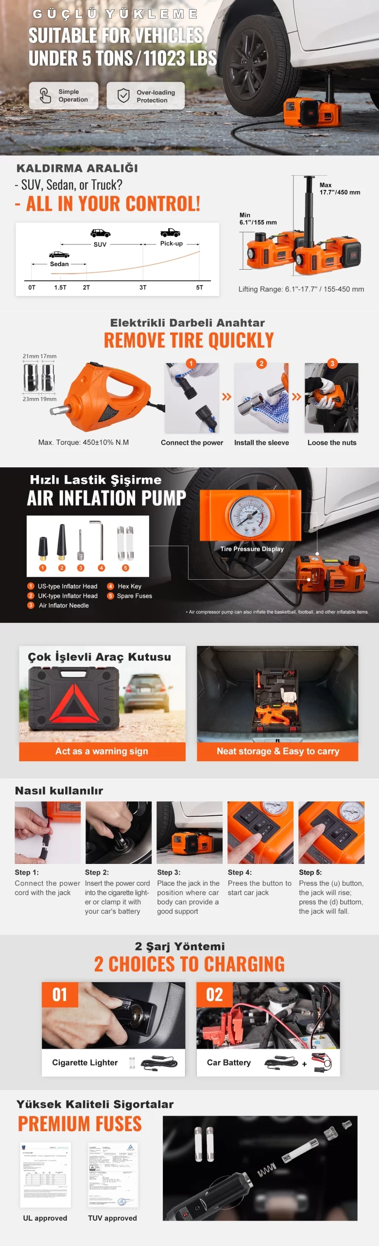 Güçlü Elektrikli Araba Krikosu: Kaldırma kapasitesi: 5,0 ton/11023 lbs. Kaldırma Aralığı: 6,1”-17,7″ / 155-450 mm. Bu elektrikli araba kriko kiti, yol kenarındaki acil durumlarda cankurtarandır ve evdeki garaj onarımları için kullanılabilir. Tüm otomobiller, sedanlar, SUV’lar, kamyonlar veya araçlarla eşleşir kapasitesine uygundur.