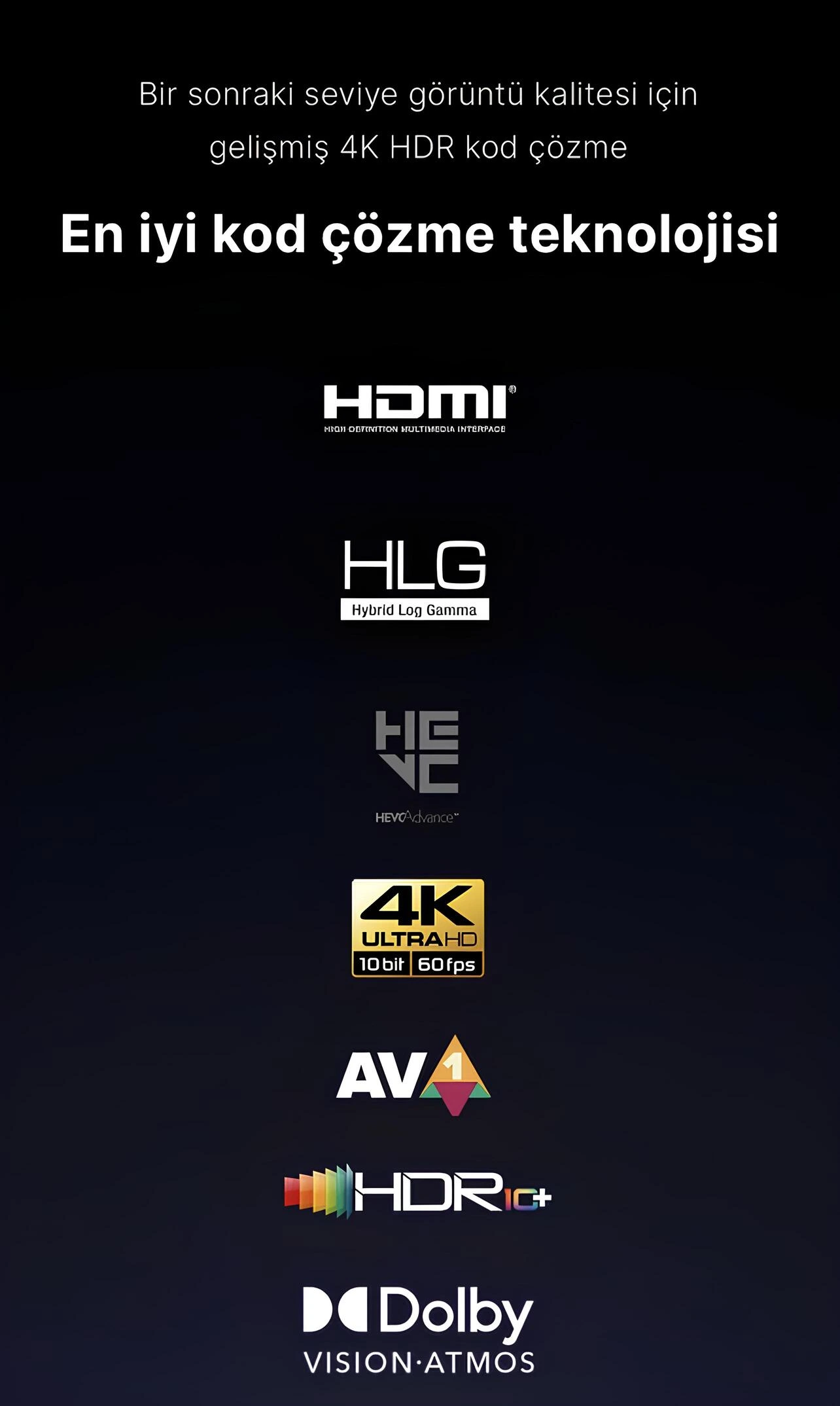 • Gelişmiş kod çözme teknolojisi. AV1, H.265 (HEVC), H.264 ve HDR10+ ve HLG dahil olmak üzere HDR ile 4K 60 fps 10 bit oynatmayı destekler ve en son canlı yayın ve yayıncılık standartlarıyla uyumluluğu garanti eder.