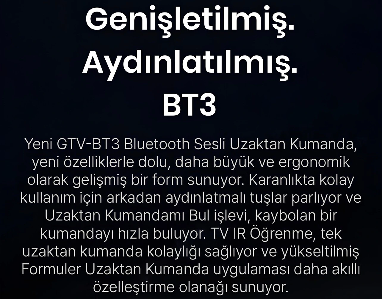 • Genişletilmiş Uzaktan Kumanda. Yepyeni GTV-BT3 Bluetooth sesli uzaktan kumanda, arkadan aydınlatmalı tuşlar, programlanabilir kısayol tuşları, “Uzaktan Kumandamı Bul” desteği ve karanlıkta bile tam kontrol sağlayan ergonomik bir tasarıma sahiptir.