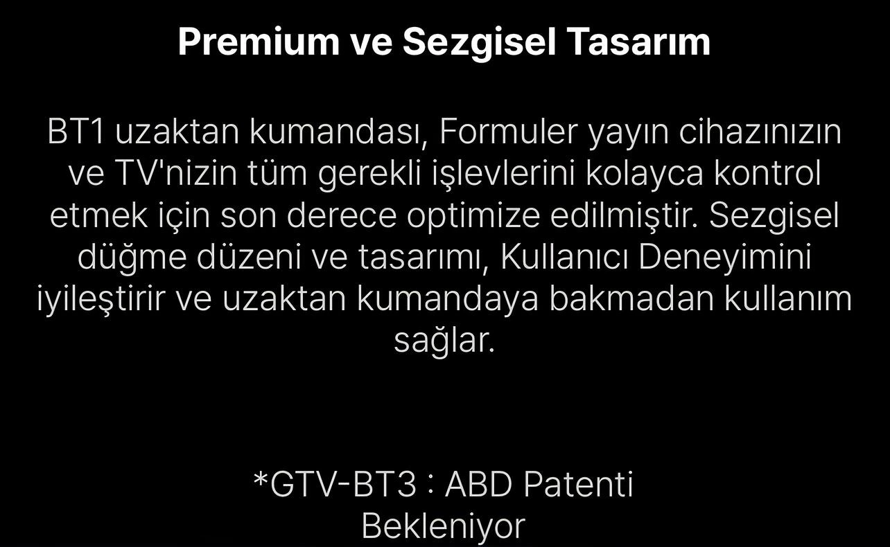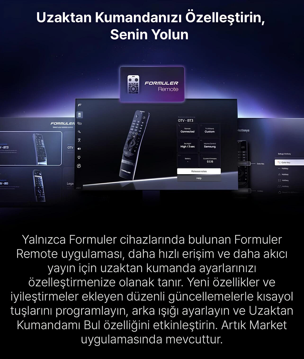 Ürün ÖzellikleriDolby Vision, Dolby Atmos, Gigabit LAN ve WiFi 6E (AX), Bluetooth arkadan aydınlatmalı sesli uzaktan kumanda ve Formuler Remote uygulaması, mytvonline3