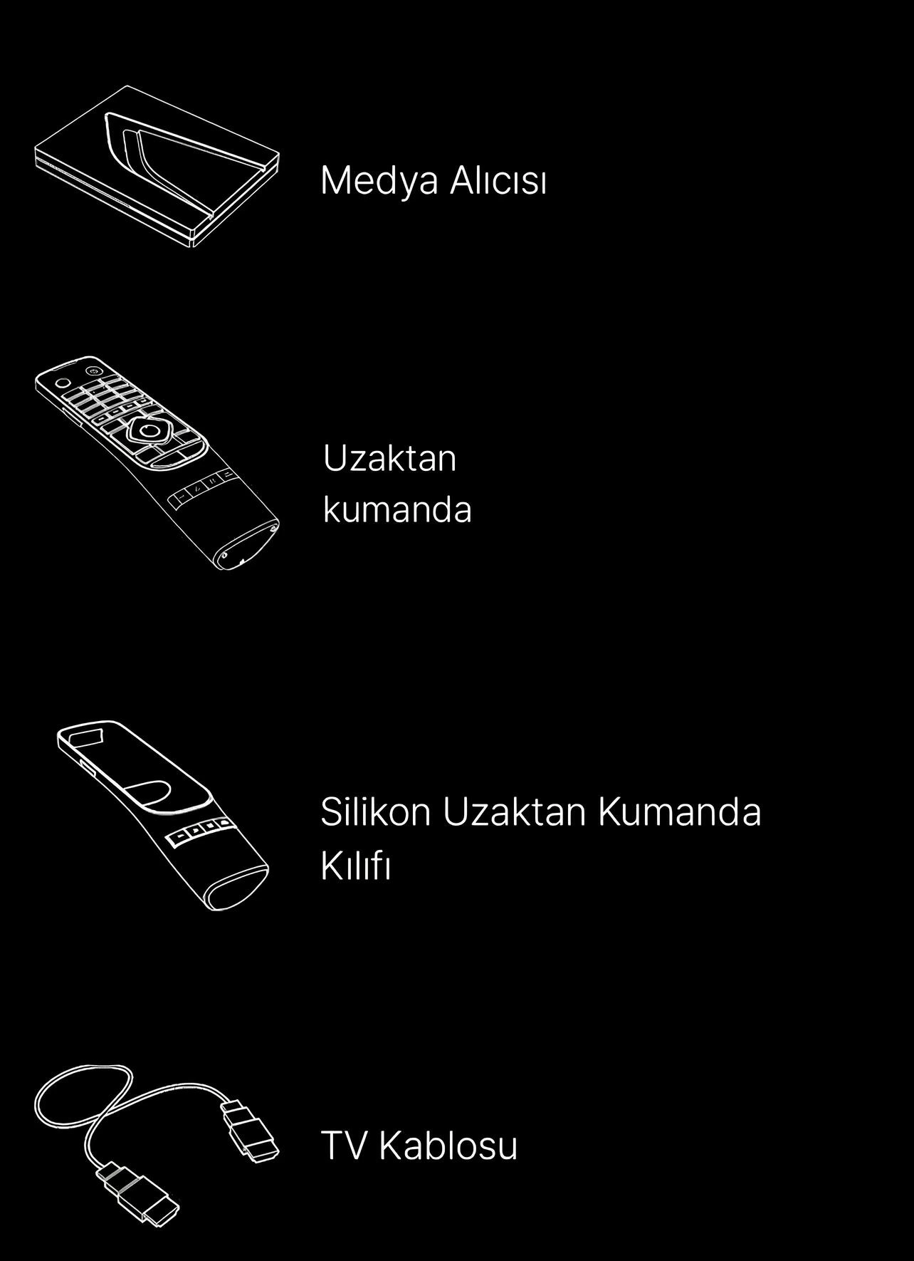 kutu içeriğiGüç adaptörü, TV kablosu, Medya alıcısı, Uzaktan kumanda