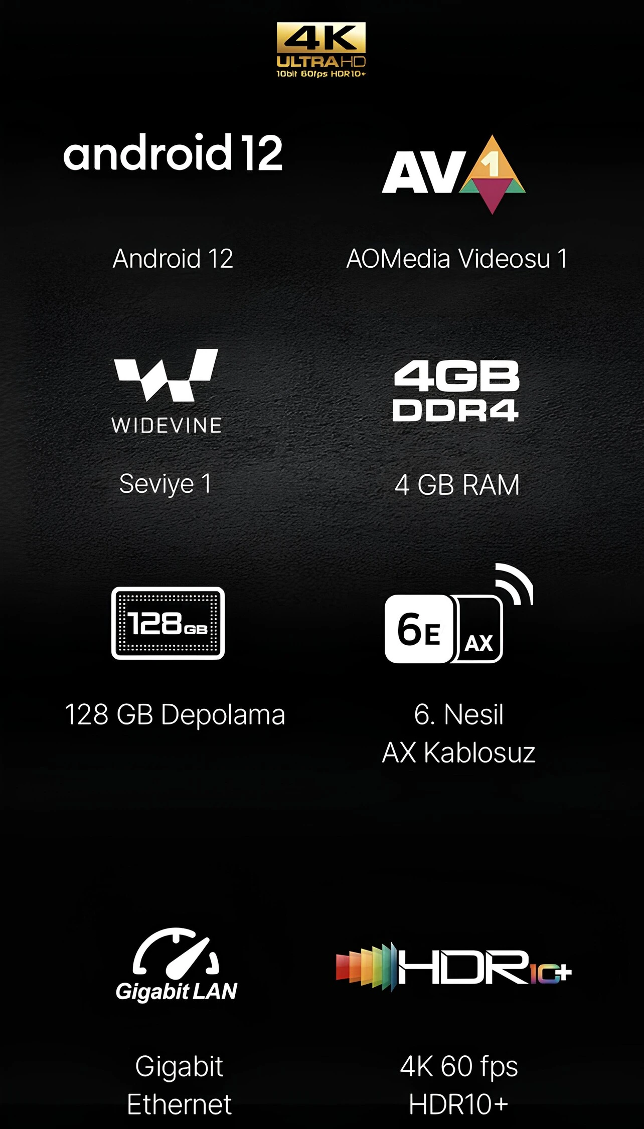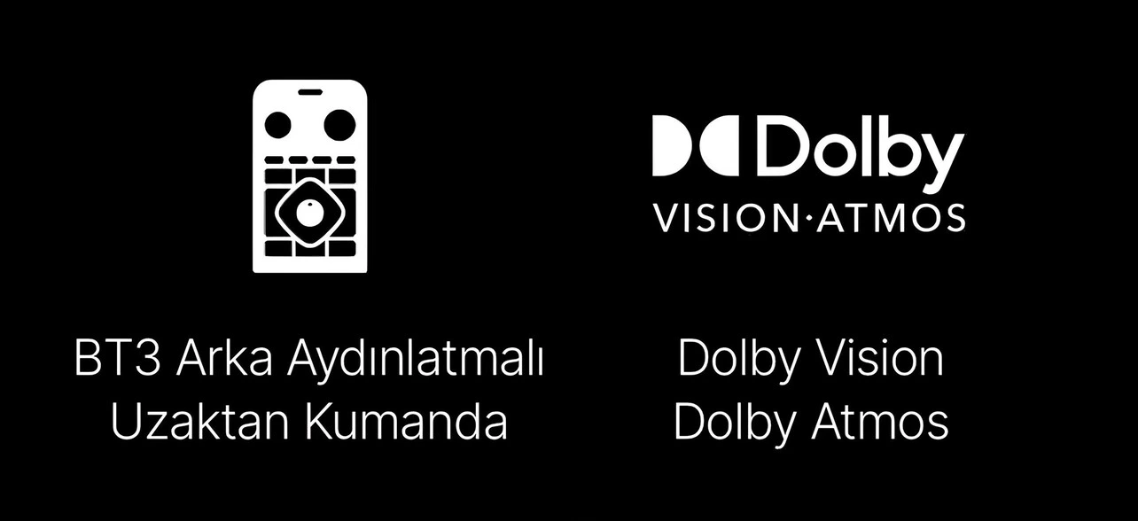 Android 12, Dolby Vision, Dolby Atmos, HDR10+, Gigabit LAN, WiFi 6E, 4 GB RAM, 128 GB ROM, Arka Aydınlatmalı Bluetooth Sesli Uzaktan Kumanda.