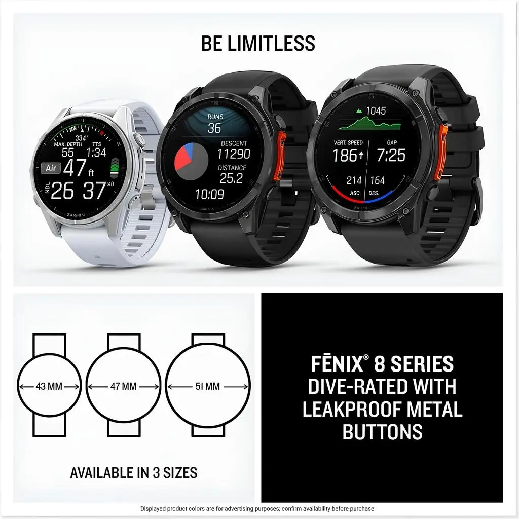 Sınırsız olun. fēnix® 8 çoklu spor GPS akıllı saat, sınırlarını zorlamak isteyen ciddi sporcular ve açık hava maceracıları için tasarlanmıştır. Büyük ve parlak 1,4 inç AMOLED ekrana, paslanmaz çelik çerçeveye ve karanlıkta görünürlük için güçlü dahili LED el fenerine sahiptir. Dahili hoparlör ve mikrofon, saatiniz akıllı telefonunuzla eşleştirildiğinde bileğinizden arama yapmanızı ve gelen aramaları yanıtlamanızı sağlar. En yeni hedefli güç antrenmanı planları ve spora özel antrenman seçenekleriyle vücudunuzun performansını, dayanıklılığını ve sakatlanma direncini artırın. Performans bilgileri, eforunuzu yönetmenize ve dayanıklılığınızı artırmanıza yardımcı olurken, antrenman hazırlığı özellikleri, kalp atış hızı, solunum, stres, uyku ve daha fazlasının 7/24 sağlık ve zindelik takibine dayalı olarak antrenmanlar arasında ne kadar toparlanma süresine ihtiyacınız olduğunu gösterir (sunulan veriler, izlenen ölçümlerin yakın bir tahminidir). Dahili ABC sensörleri ve Wi-Fi® bağlantısıyla kolayca indirilebilen TopoActive haritalarıyla parkurlara çıkın. Dinamik gidiş-dönüş rota özelliği, koşularınızın veya sürüşlerinizin planlamasını basitleştirmenize yardımcı olur; hedef mesafenizi belirlemenize ve sizi geri götürmek için ayarlanan adım adım yol tarifleri almanıza olanak tanır. Planladığınız başlangıç için. Akıllı saat modunda 29 güne kadar pil ömrüyle şebekeden uzakta uzun maceraların keyfini çıkarın. Ayrıca, 40 metre dalış derecesi ve sızdırmaz metal düğmeler, maceranın derinliklerine ulaşmanızı sağlar. Ek özellikler arasında müzik depolama, Garmin Pay™ temassız ödemeler (desteklenen ülke ve ödeme ağıyla), akıllı bildirimler (uyumlu akıllı telefon gereklidir) ve daha fazlası bulunur.