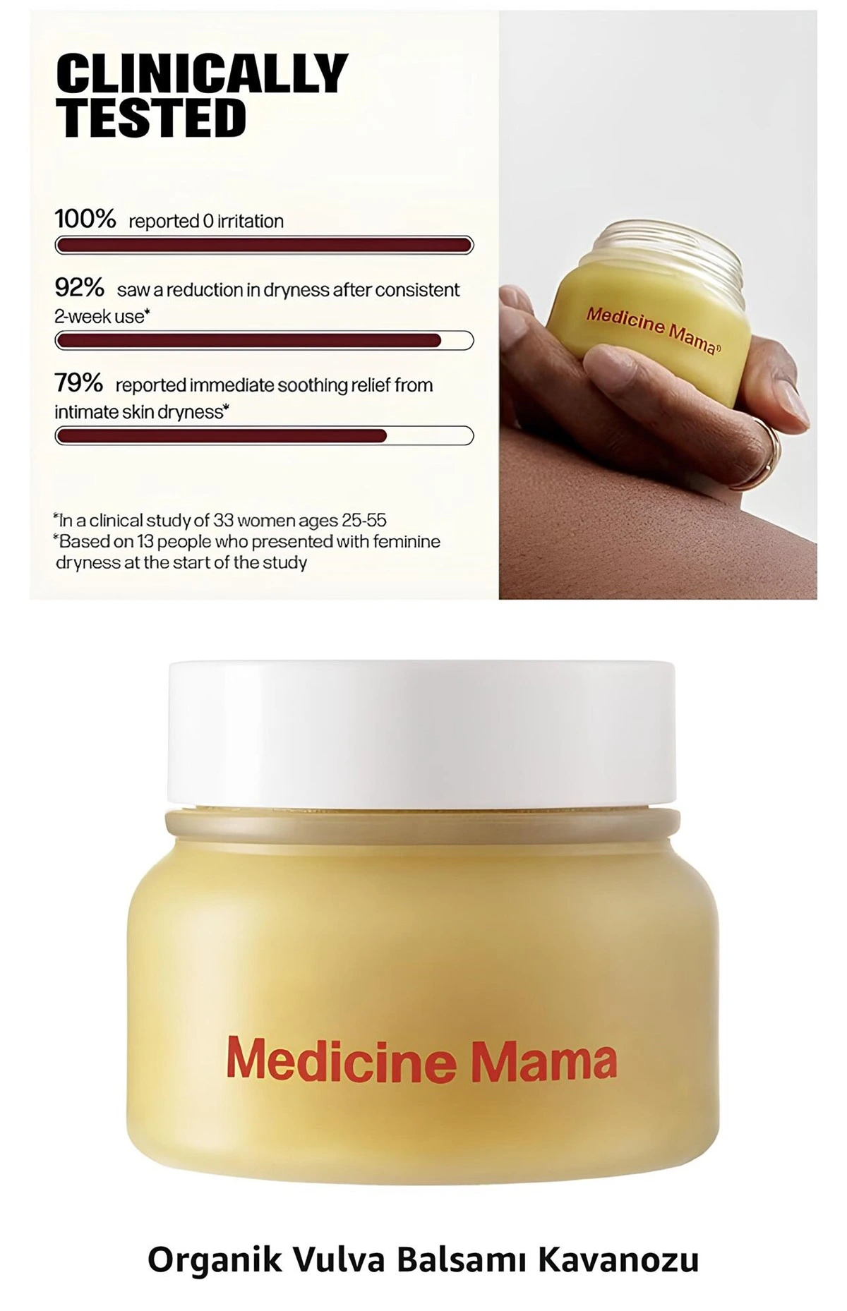 - Klinik Olarak Kanıtlanmıştır: 25-55 yaş aralığındaki 33 kadın üzerinde yapılan klinik bir çalışmada, kadınların %100’ü tahriş olmadığını ve %79’u samimi cilt kuruluğundan anında rahatlama sağladığını bildirmiştir.