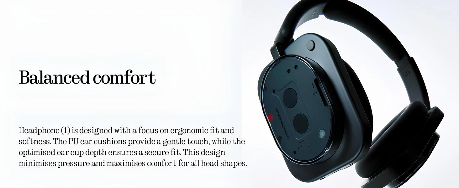 Nothing Headphone (1), ergonomik uyum ve yumuşaklık odaklı olarak tasarlandı. PU kulak yastıkları cilde nazik bir temas sağlarken, optimize edilmiş kulaklık derinliği güvenli bir oturuş sunar. Bu tasarım, baş şekli fark etmeksizin baskıyı azaltır ve uzun süreli konfor sağlar.