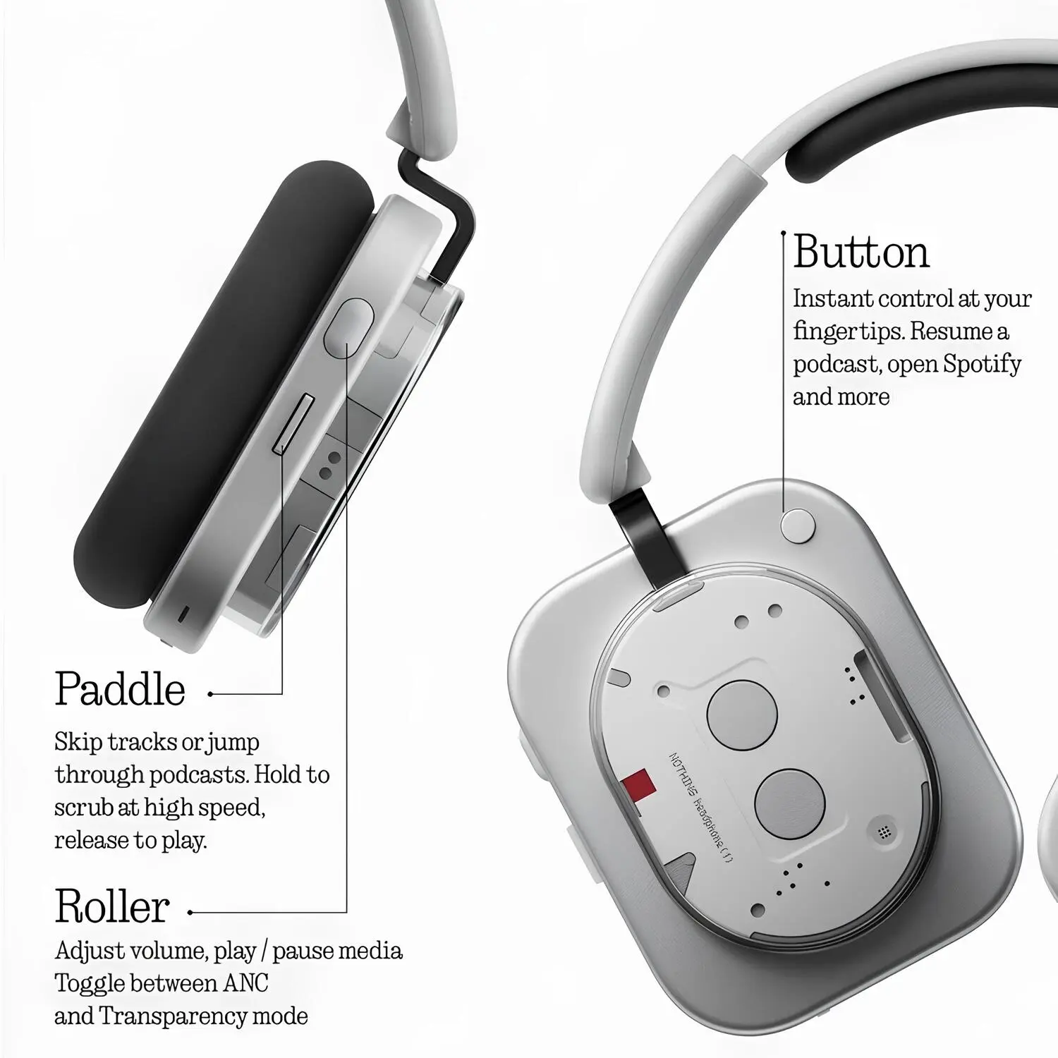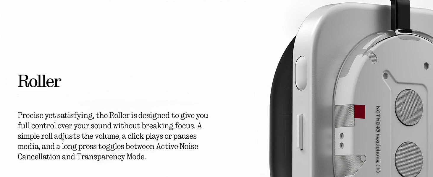 Hassas ama tatmin edici bir tasarıma sahip Roller, müziğin üzerinde tam kontrol sağlar. Basit bir çevirmeyle ses seviyesini ayarlayabilir, tek tıklamayla oynatmayı başlatabilir veya durdurabilir, uzun basarak aktif gürültü engelleme (ANC) ile şeffaflık modu arasında geçiş yapabilirsiniz.