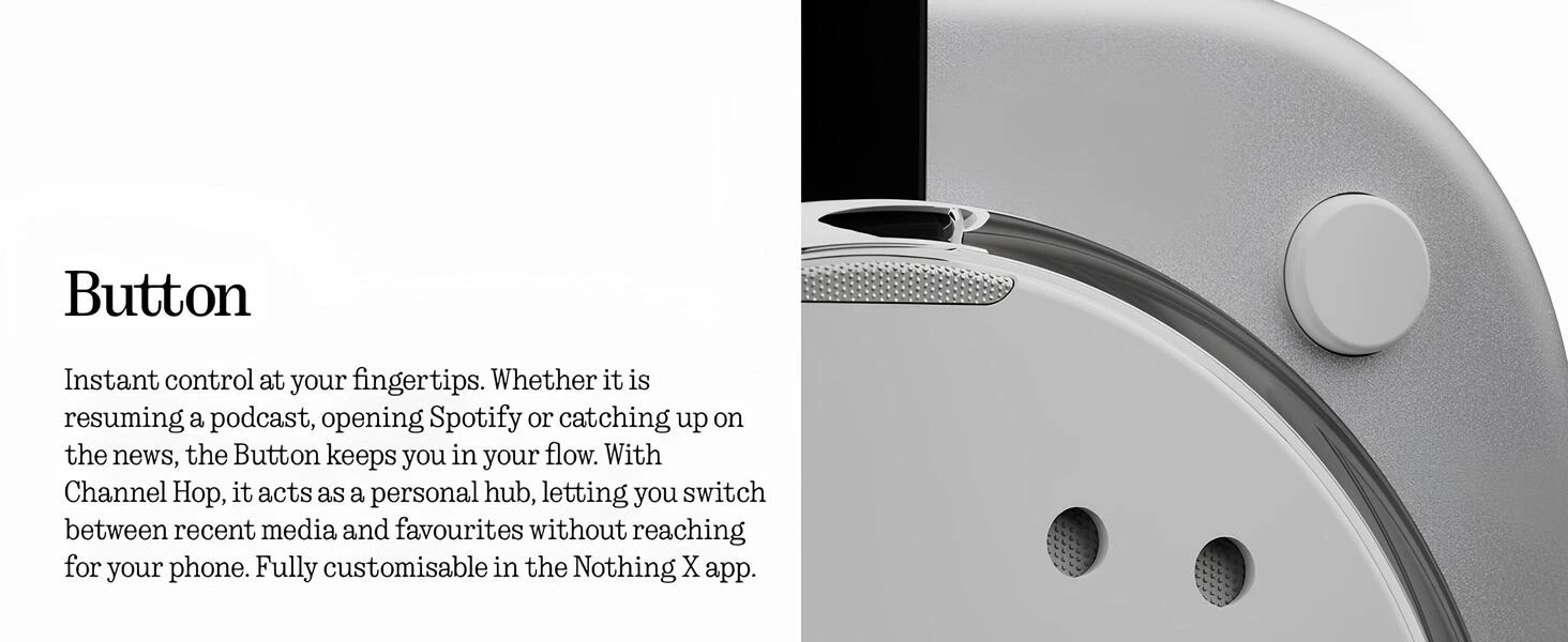 Podcast’e devam etmek, Spotify’ı açmak veya haberleri dinlemek… Tek bir dokunuşla hepsi elinizin altında. “Channel Hop” özelliği sayesinde son dinlediğiniz medya veya favorileriniz arasında kolayca geçiş yapabilirsiniz. Tüm işlevler Nothing X uygulaması üzerinden kişiselleştirilebilir.