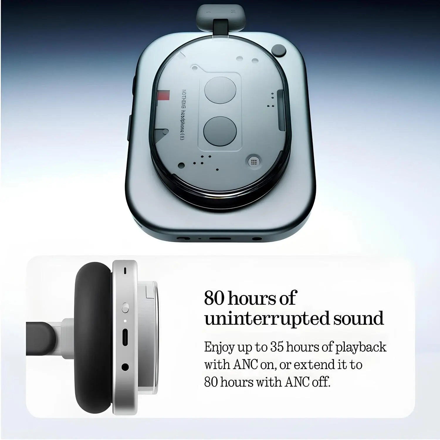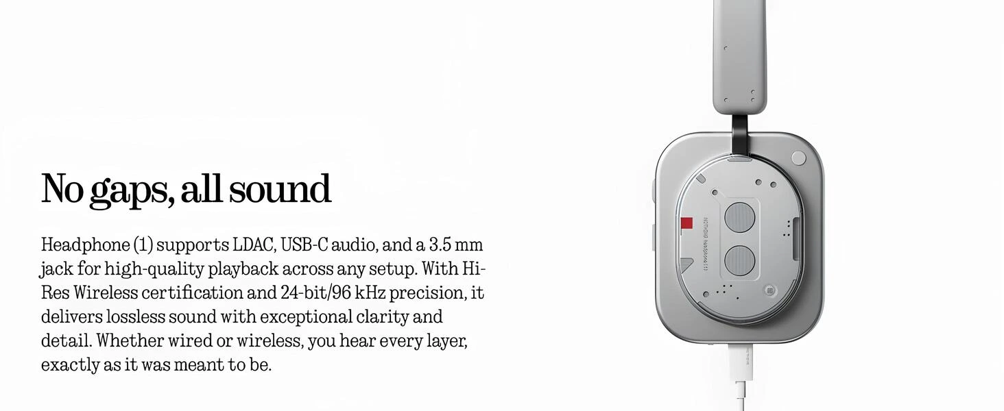 LDAC, USB-C ve 3.5 mm jak desteğiyle Nothing Headphone (1), 24-bit / 96 kHz çözünürlükte kayıpsız ses sunar. Kablolu veya kablosuz fark etmeksizin her ayrıntıyı kristal netliğinde duymanı sağlar.