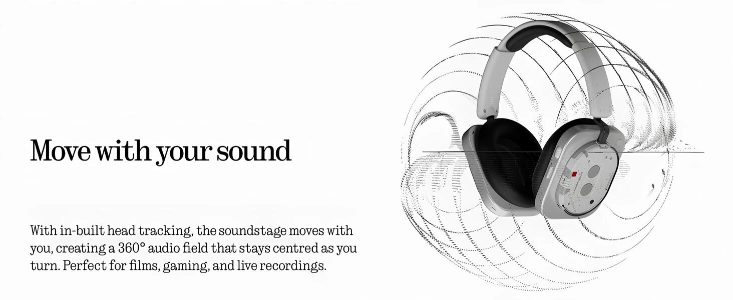 Baş takibi özelliği sayesinde Nothing Headphone (1), 360° ses alanını seninle birlikte döndürür. Hangi yöne bakarsan bak ses merkezde kalır ve film, oyun ya da canlı yayınlarda çevresel bir ses deneyimi oluşturur.