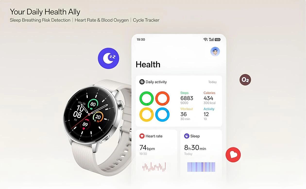 Zarafet Yeniden Tanımlandı, Zeka Yeniden Şekillendi – Daha küçük, daha ince, daha hafif yapı – Cilalı paslanmaz çelik kasa ve kurma koluAkıllı Performans, Eşsiz Dayanıklılık – Akıllı Modda 60 saate kadar pil ömrü360 Zihin ve Beden – Gerçek zamanlı durum barometresi – Zihin ve vücut trend analizi – Enerji dolu (Wellness: 90)Günlük Sağlık Asistanınız – Uyku sırasında nefes riski tespiti, kalp atış hızı ve kan oksijen ölçümü, döngü takibiProfesyonel Seviye Fitness Takibi – 11 Pro-Level fitness modu – Yağ yakım değerlendirmesi