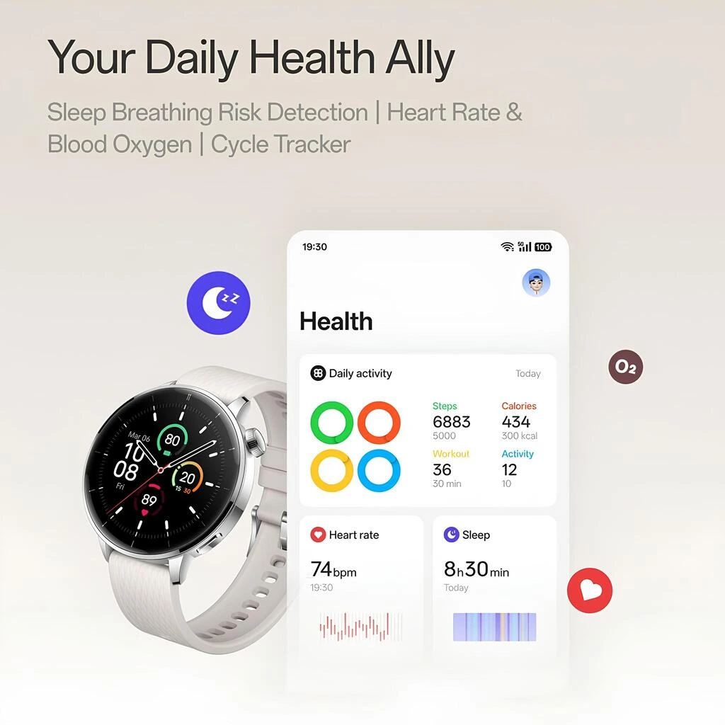 Karşınızda sofistike tasarım ve ileri teknolojinin başyapıtı OnePlus Watch 3. Bu şık 43 mm akıllı saat, cilalı paslanmaz çelik kasa ve kurma koluna, konforlu floroelastomer kayışla tamamlanıyor. Parlak 1,32 inç yuvarlak ekran bildirimlerinizi hayata geçirirken, sağlam IP68 su geçirmezlik derecesi çeşitli koşullarda dayanıklılığı garantiliyor. WearOS ile çalışan saat, uykuda solunum riski tespiti, kalp atış hızı takibi, kan oksijen ölçümü ve döngü takibi gibi kapsamlı sağlık takibi sunuyor. 32 GB depolama kapasitesi ve çoklu sistem GPS desteğiyle tüm fitness maceralarınıza hazır. Saat, 11 profesyonel mod ve yağ yakma değerlendirme özellikleriyle fitness takibinde öne çıkıyor. Etkileyici 345 mAh pili, Akıllı Modda 60 saate kadar kullanım sunarak daha uzun süre bağlantıda kalmanızı sağlıyor. Gerçek zamanlı durum barometresi ve kapsamlı zihin-beden trend analizi, onu mükemmel bir sağlıklı yaşam arkadaşınız yapıyor. İster günlük aktivitelerinizi takip ediyor olun ister sağlık ölçümlerinizi ölçüyor olun, bu akıllı saat, kompakt ve hafif bir form faktöründe zarafeti zekayla birleştiriyor.