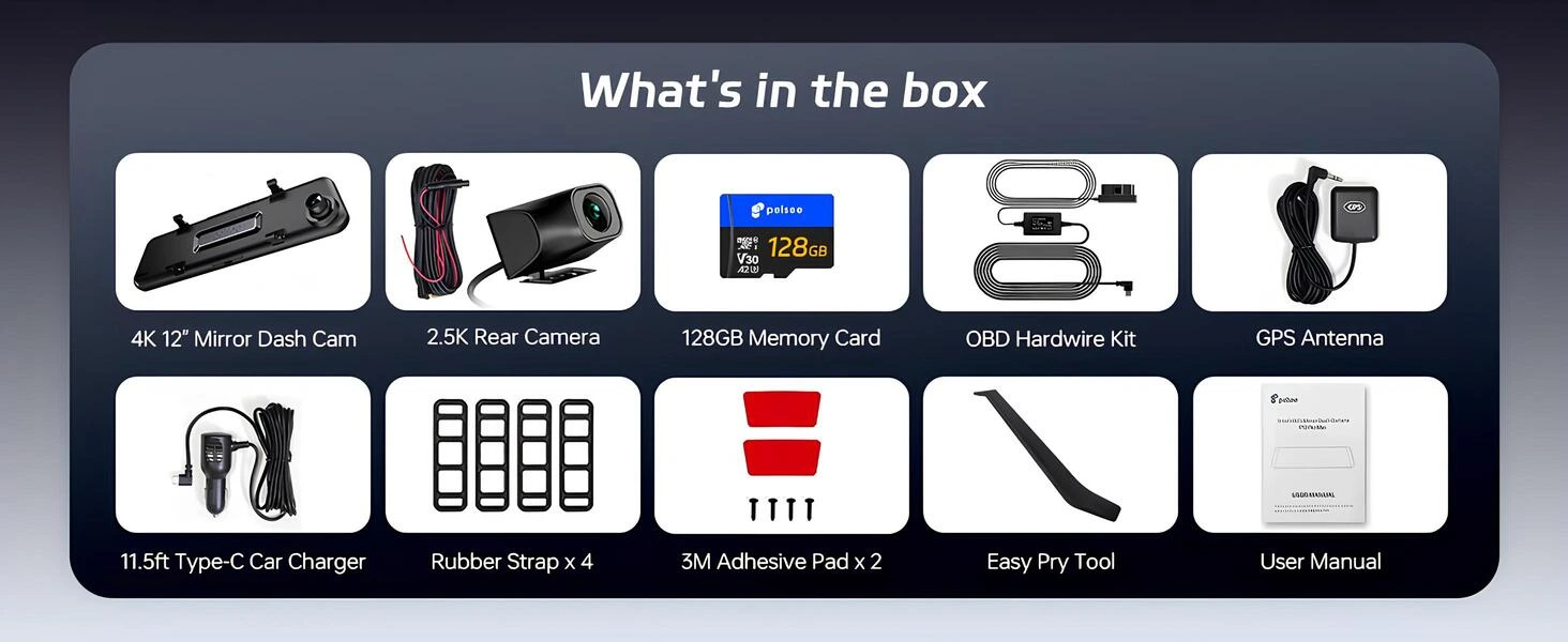 Dahil Bileşenler (kutu içeriği) 1 x 128 GB Hafıza Kartı, 1 x 2,5K Arka Kamera Kiti (19,6 ft arka kamera kablosu), 1 x 4K Aynalı Gösterge Paneli Kamerası, 1 x GPS Modülü, 1 x OBD Sabit Kablolama Kiti1 x 128 GB Hafıza Kartı, 1 x 2,5K Arka Kamera Kiti (19,6 ft arka kamera kablosu), 1 x 4K Aynalı Gösterge Paneli Kamerası, 1 x GPS Modülü, 1 x OBD Sabit Kablolama Kiti