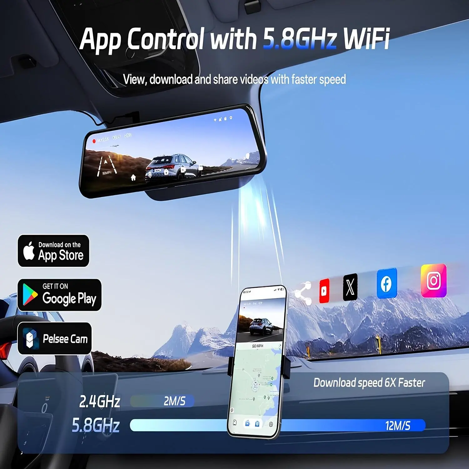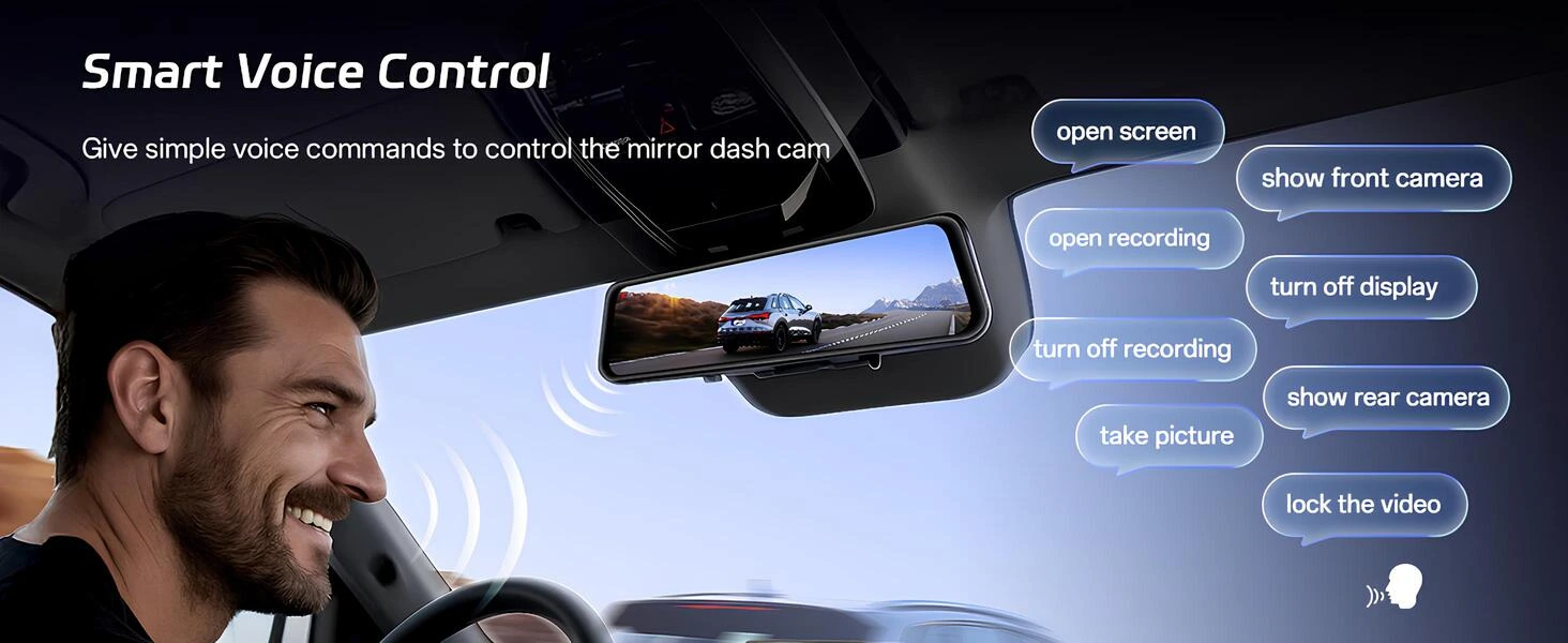 - 3 Yolla Zahmetsiz Kontrol: Birden fazla kontrol seçeneğini kullanarak dikiz aynası kameranızı kolayca yönetin. Doğrudan çalıştırmak için geri görüş kamerası aynası ekranına dokunun, eller serbest kullanım kolaylığı için “Ekranı aç” veya “Arka kamerayı göster” gibi basit sesli komutları kullanın veya özel Pelsee uygulaması aracılığıyla ayarları yapılandırmak, önizleme yapmak, oynatmak, indirmek, düzenlemek ve videoları zahmetsizce paylaşmak için telefonunuzla eşleştirin.
