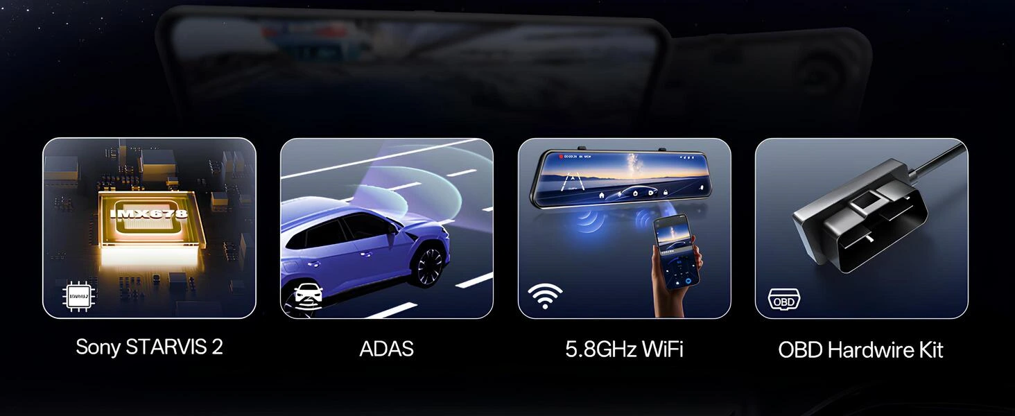 Özel Özellik 5,8 GHz WiFi, Çift Starvis, Tam Renkli Gece Görüşü, OBD Sabit Kablolama Kiti Dahil, Ses Kontrolü
