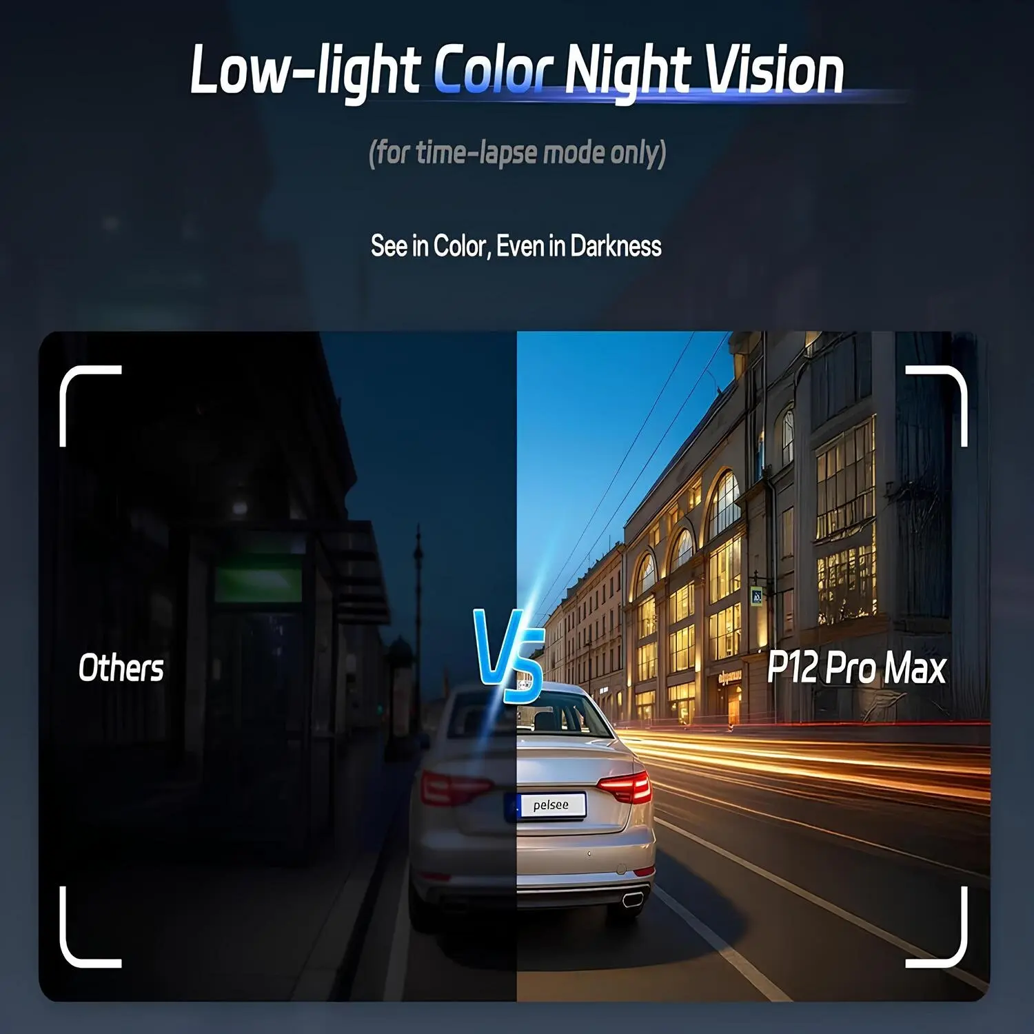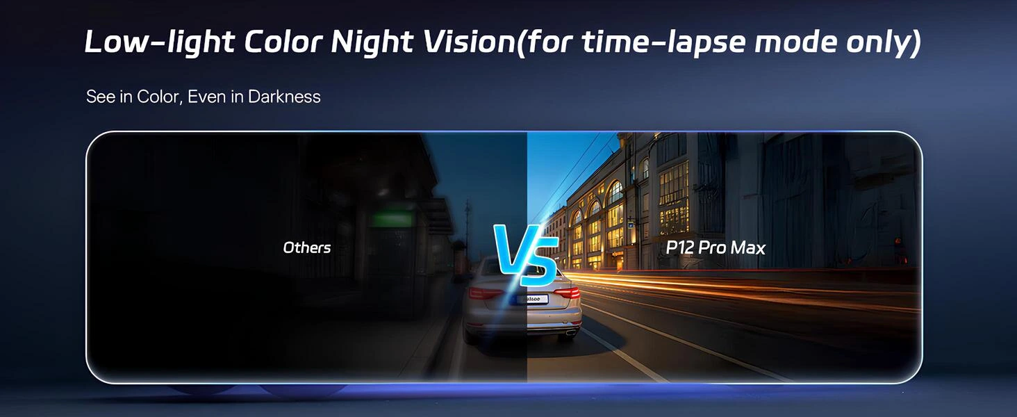 - Park Modunda Tam Renkli Gece Görüşü: P12 Pro Max dikiz aynası araç kamerası, gelişmiş tam renkli gece görüşüne sahiptir ve diğer kameraların siyah beyaza geçtiği düşük ışıklı ortamlarda bile zaman atlamalı park gözetimi sırasında net ve renkli kayıt yapılmasını sağlar