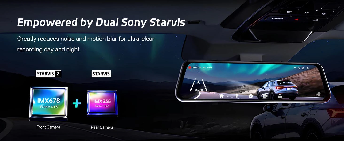 - 4K+2.5K Çift Kayıt, Çift Starvis: Ön kamera, standart sensörlerin iki katı ışık yakalayarak mükemmel düşük ışık netliğiyle 30 fps’de gerçek 4K görüntü sunan gelişmiş STARVIS 2 IMX678 sensöre sahiptir. Arka kamera, 2.5K kayıt yapmak için STARVIS IMX335 sensörünü kullanarak gece gündüz net ve güvenilir çekimler sağlar.