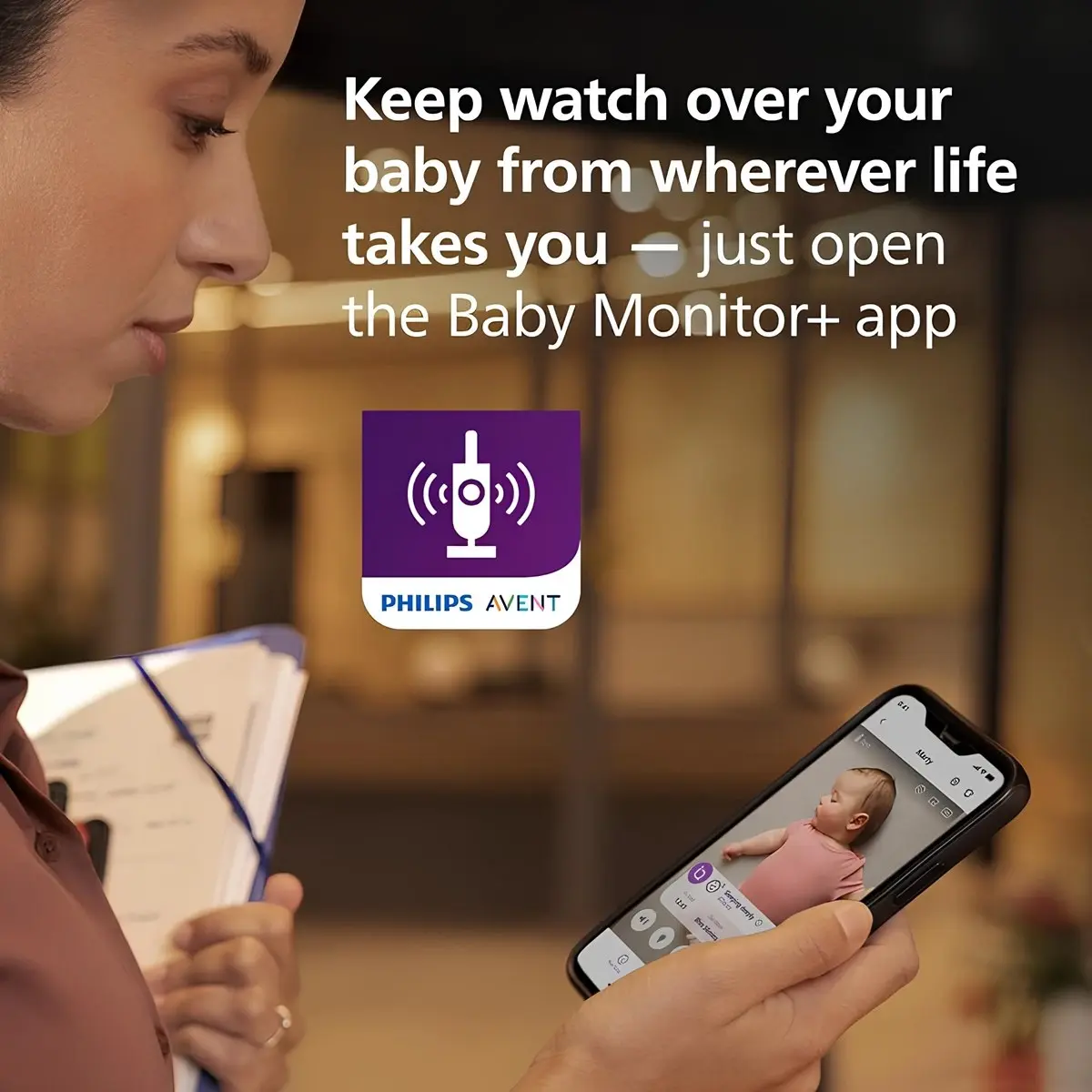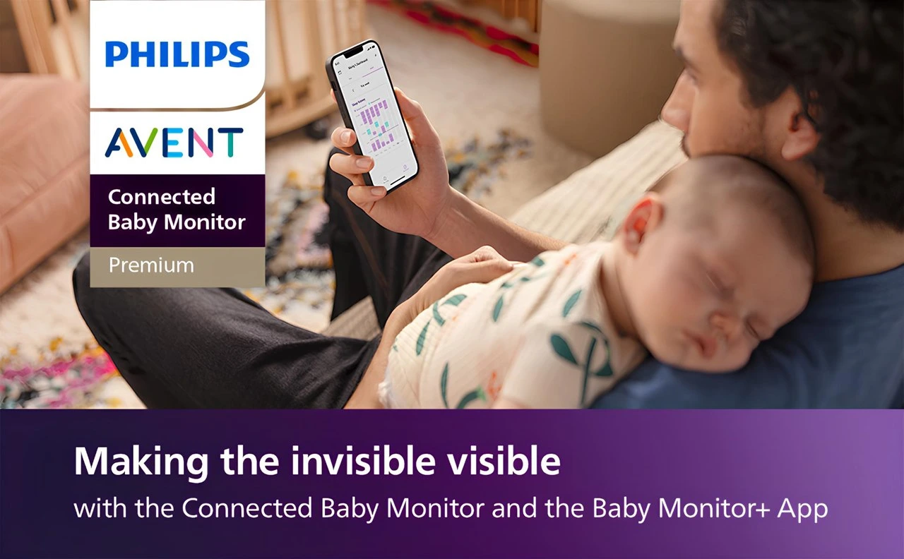 Alt metin: philips avent bağlantılı bebek monitörü baba kucağında uyuyan bebek ve uygulama takibi