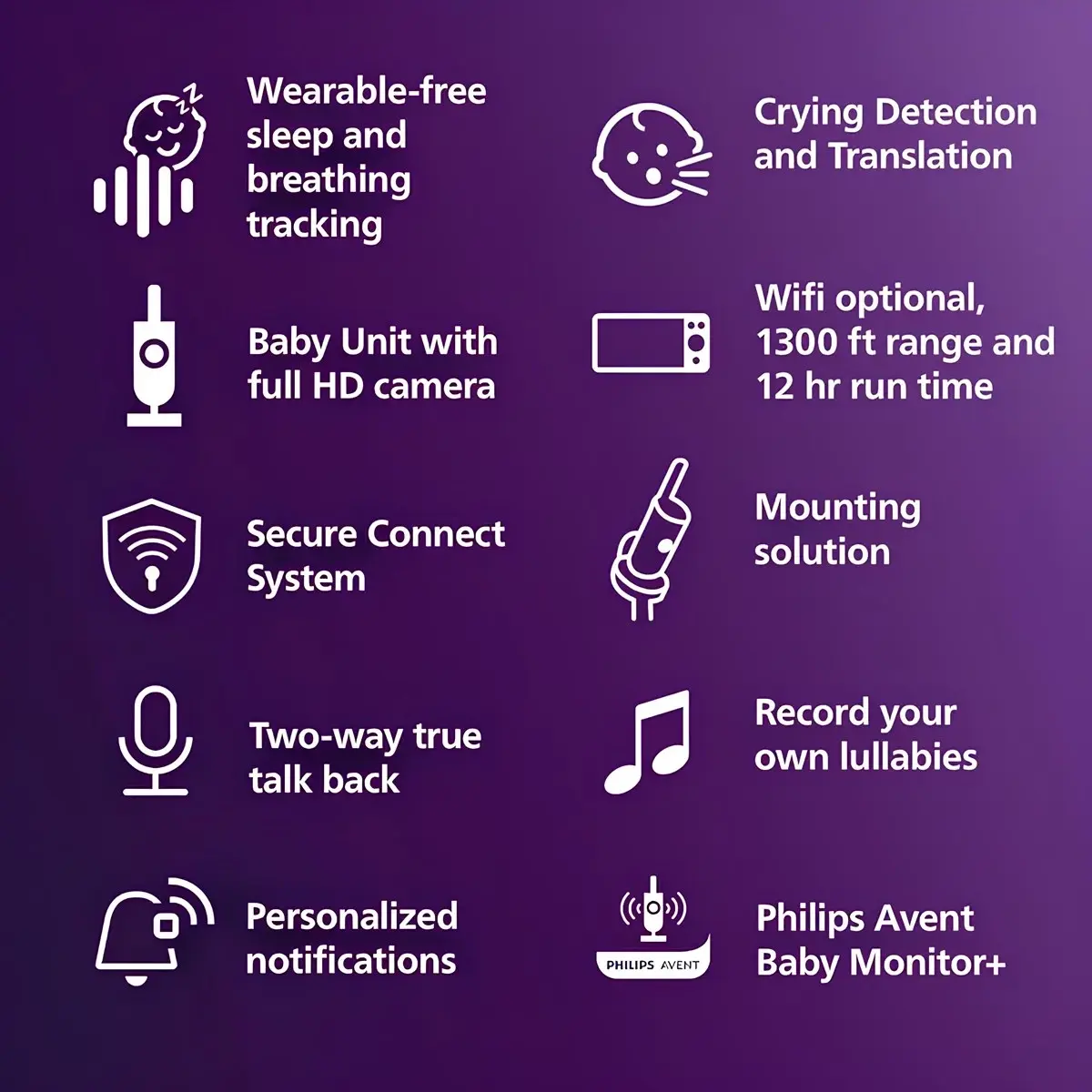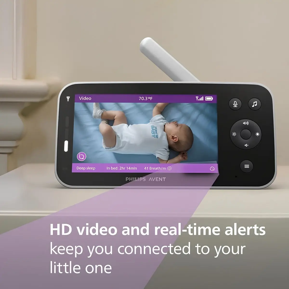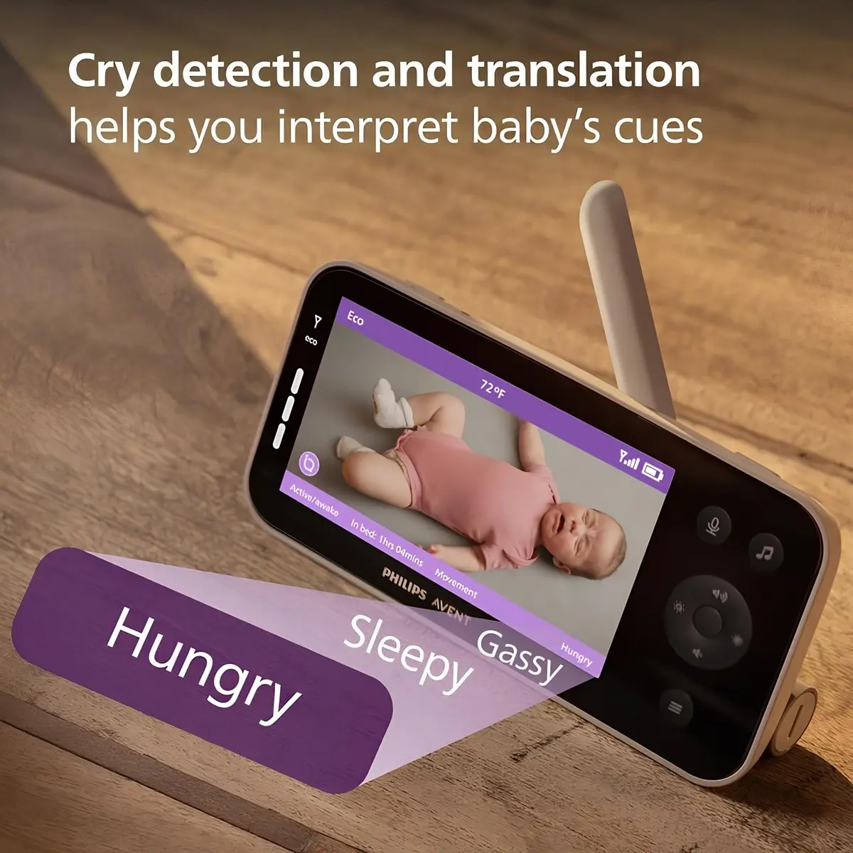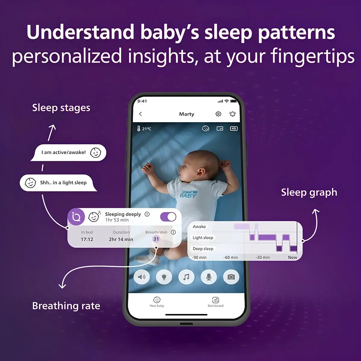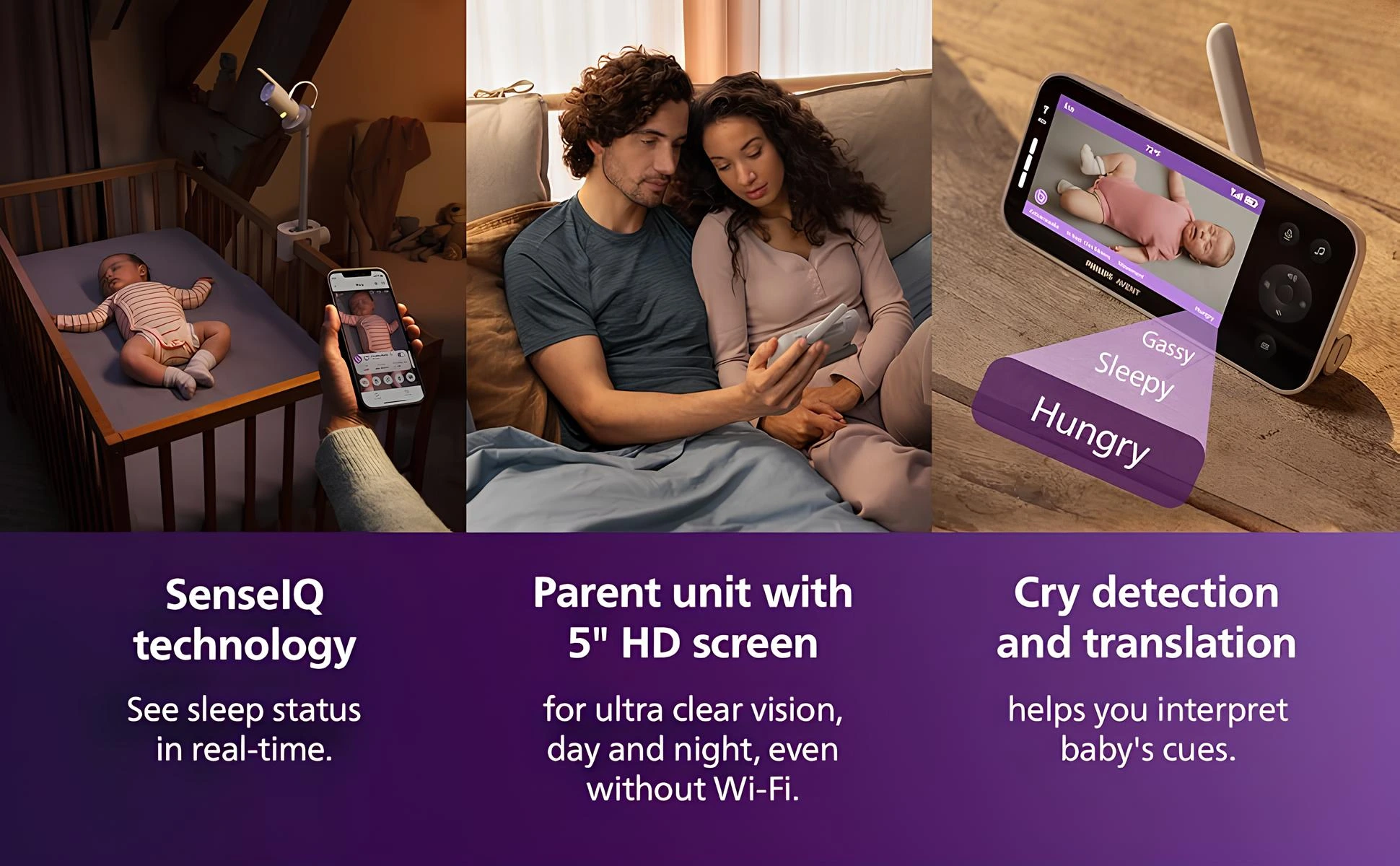 SenseIQ teknolojisi ile uyku durumunu gerçek zamanlı görün • 5 inç HD ekranlı ebeveyn ünitesi ultra net görüntü sunar gündüz ve gece Wi-Fi olmadan bile • Ağlama algılama ve yorumlama bebeğin ipuçlarını anlamanıza yardımcı olur