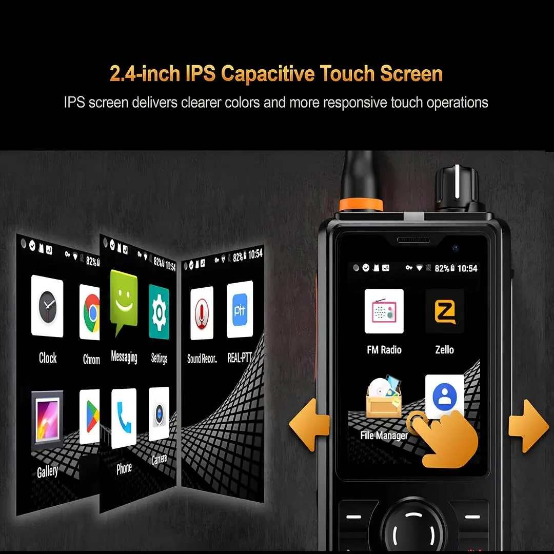 • 2,4 inç IPS kapasitif dokunmatik ekran, 320 x 240 çözünürlük. MT6739 Dört Çekirdekli 1 GB RAM + 8 GB ROM, çift SIM kart desteği, 64 GB’a kadar Micro SD kart desteği. (Lütfen dikkat: Telsizin üst kısmındaki döner düğme, ses kontrolü olarak değil, gruplar arasında geçiş yapmak için kullanılır. Yan taraftaki düğmeler ses kontrolüdür.)