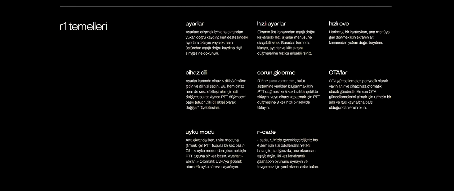 R1’inizi en son yazılım güncellemeleriyle güncel tutun. Bulut güncellemeleri hazır olduklarında yayınlanır ve cihazınızda herhangi bir işlem yapmanıza gerek yoktur. Kablosuz (OTA) güncellemeler düzenli olarak yayınlanır ve cihazınıza otomatik olarak gönderilir. En son OTA güncellemelerini almak için R1’inizin bir ağa bağlı olduğundan emin olun. Tüm önceki yazılım sürüm notlarımızı görmek için topluluk forumumuzu ziyaret edin.