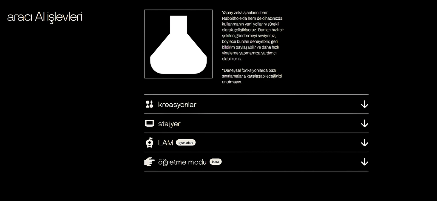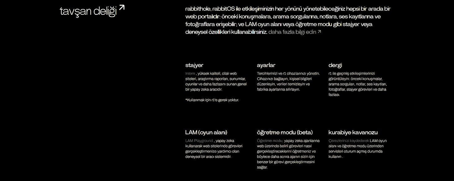 Rabbithole, rabbitOS ile etkileşiminizin her yönünü yöneten hepsi bir arada bir web portalıdır. Rabbithole’u kullanarak uygulamalara giriş yapın, bunları r1’inizden kontrol edin, konuşmaları, arama sorgularını, notları, ses kayıtlarını, fotoğrafları görün ve yeni deneysel özellikler LAM playground ve teachmode’u kullanın.