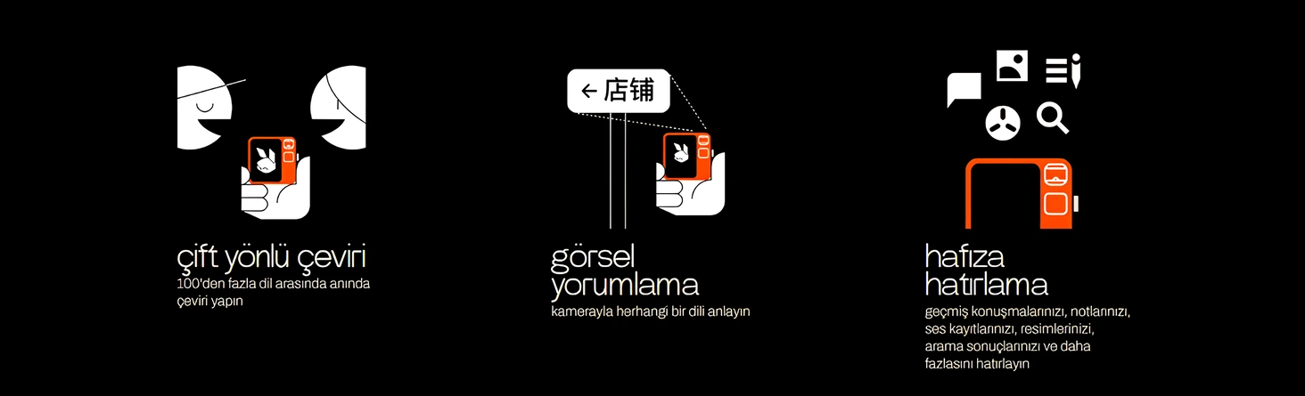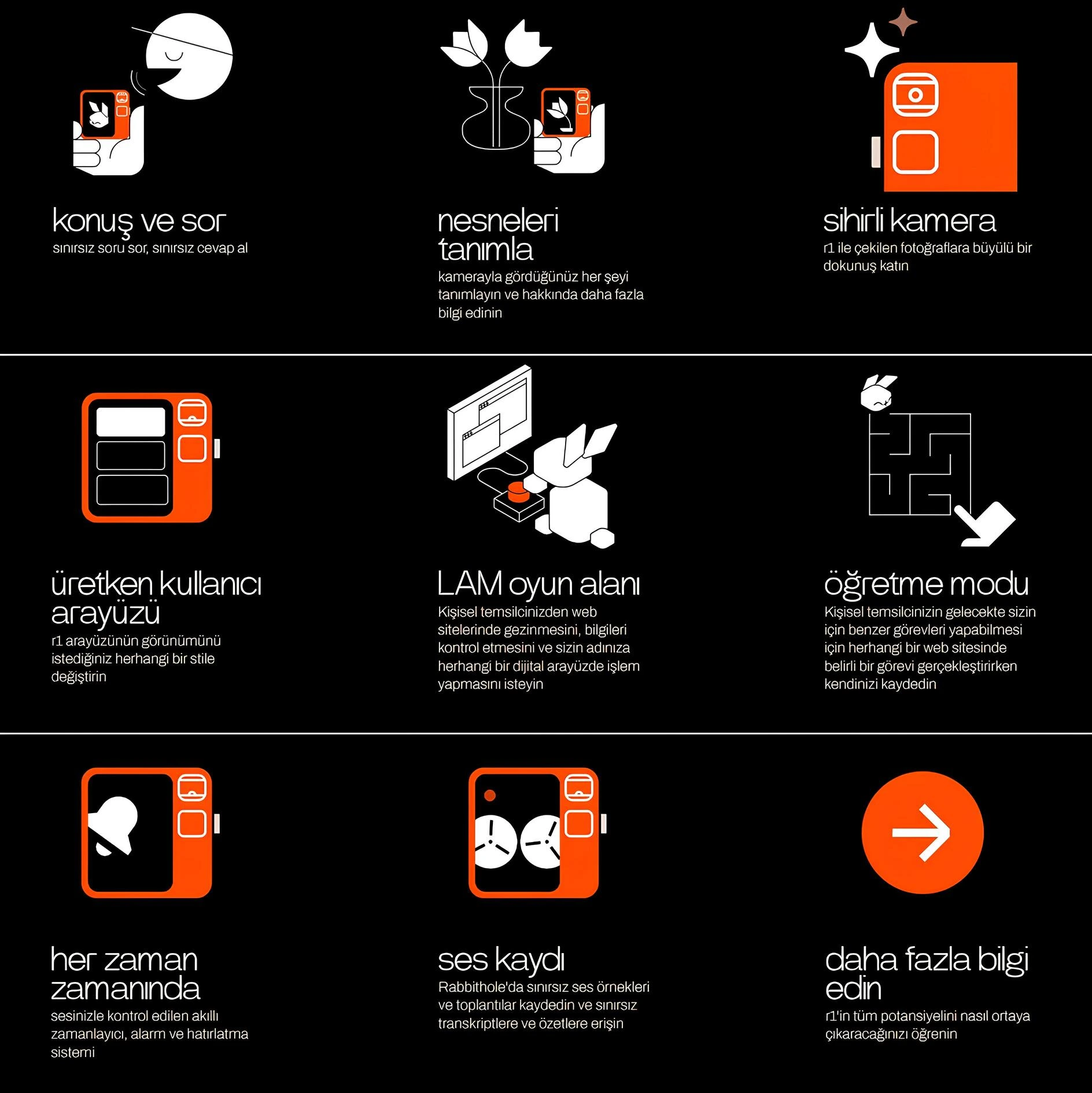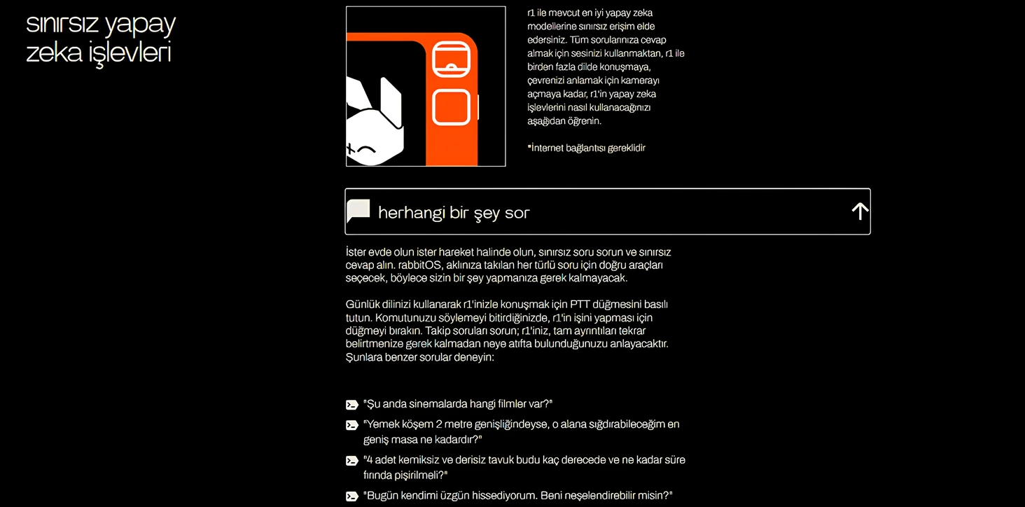 - Yeni nesil yapay zeka ajanları, yerleşik: Web’de gezinmek, eylemlerde bulunmak ve hatta görevleri tamamlamak için özel bir yapay zeka asistanı oluşturmak için rabbitOS’u LAM Playground, Teaching Mode ve rabbitOS Intern ile kullanın.