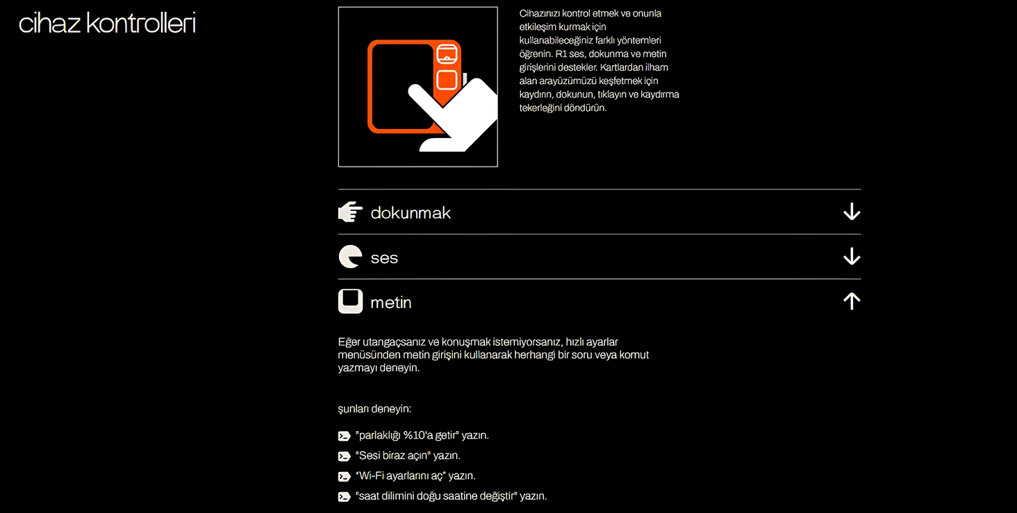 Bas-konuş düğmesine tıkladığınızda r1 dinlemeye başlar. Herhangi bir sesli komutu konuşmaya başlamak veya ihtiyaç duyduğunuz herhangi bir araca erişmek için basılı tutmanız yeterlidir.