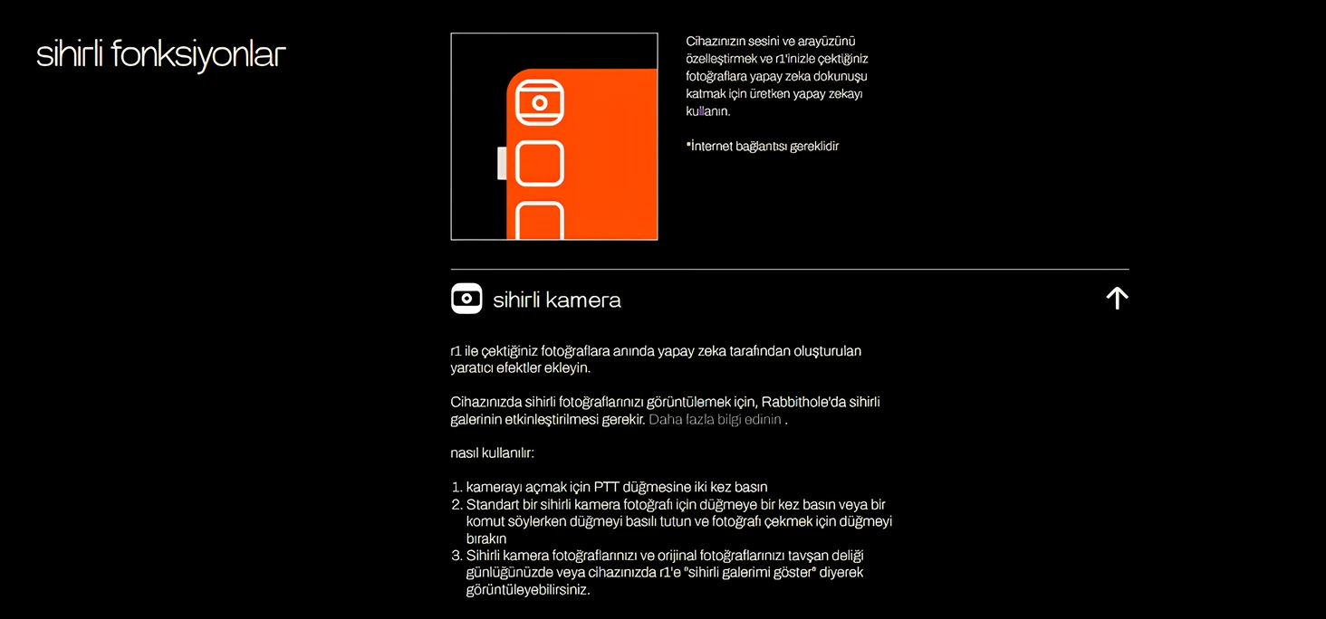 Sihirli kamera fotoğraflarınızı ve orijinal fotoğraflarınızı tavşan deliği günlüğünüzde veya cihazınızda r1’e “sihirli galerimi göster” diyerek görüntüleyebilirsiniz.
