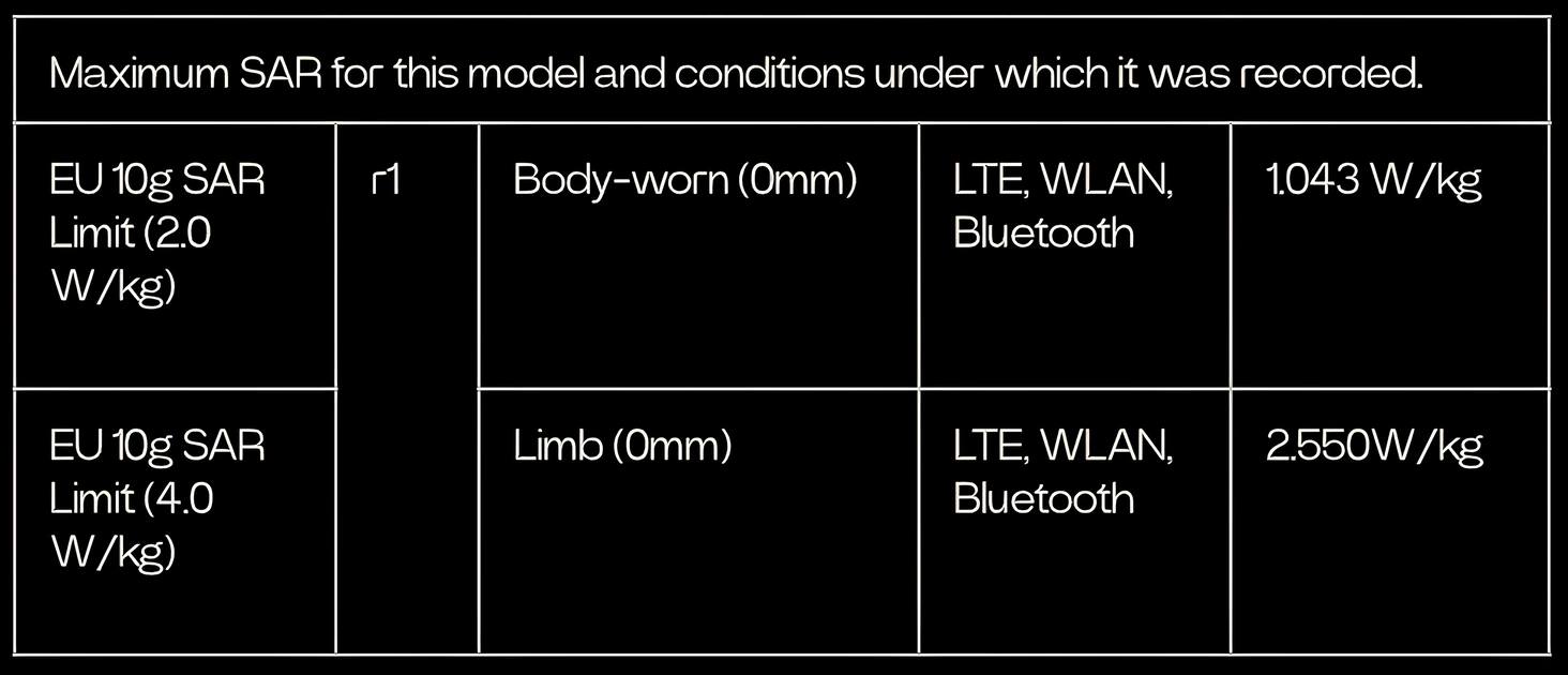SAR testleri, cihazın test edilen tüm frekans bantlarında onaylı en yüksek güç seviyesinde iletim yaptığı standart çalışma pozisyonlarında gerçekleştirilir. ICNIRP yönergeleri kapsamında cihaz modeliniz için en yüksek SAR değerleri aşağıda listelenmiştir: