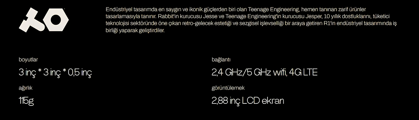 Endüstriyel tasarımda en saygın ve ikonik güçlerden biri olan Teenage Engineering, hemen tanınan zarif ürünler tasarlamasıyla tanınır. Rabbit’in kurucusu Jesse ve Teenage Engineering’in kurucusu Jesper, 10 yıllık dostluklarını, tüketici teknolojisi sektöründe öne çıkan retro-gelecek estetiği ve sezgisel işlevselliği bir araya getiren R1’in endüstriyel tasarımında iş birliği yaparak geliştirdiler.