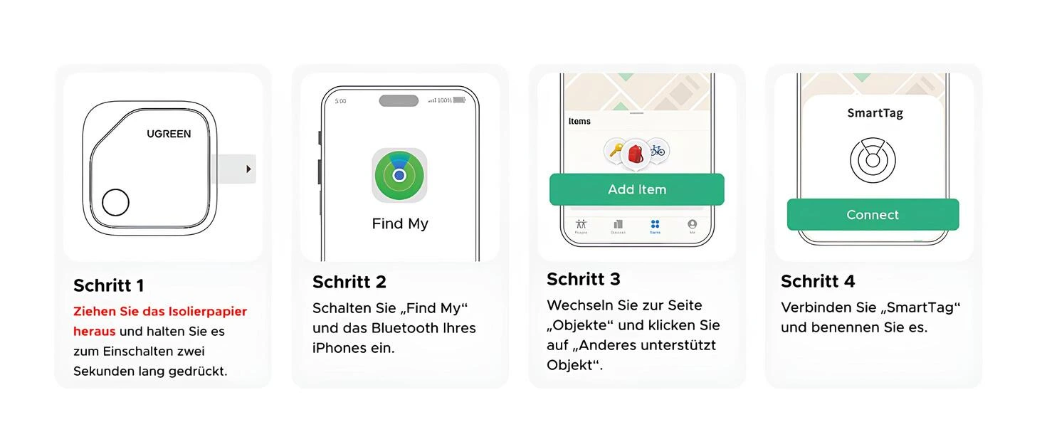 Adım 1: İzolasyon kâğıdını çekin ve 2 saniye basılı tutun · Adım 2: iPhone’da Find My ve Bluetooth’u açın · Adım 3: Objeler sekmesine geçip “Diğer desteklenen öğe”ye dokunun · Adım 4: SmartTag’i bağlayın ve isim verin