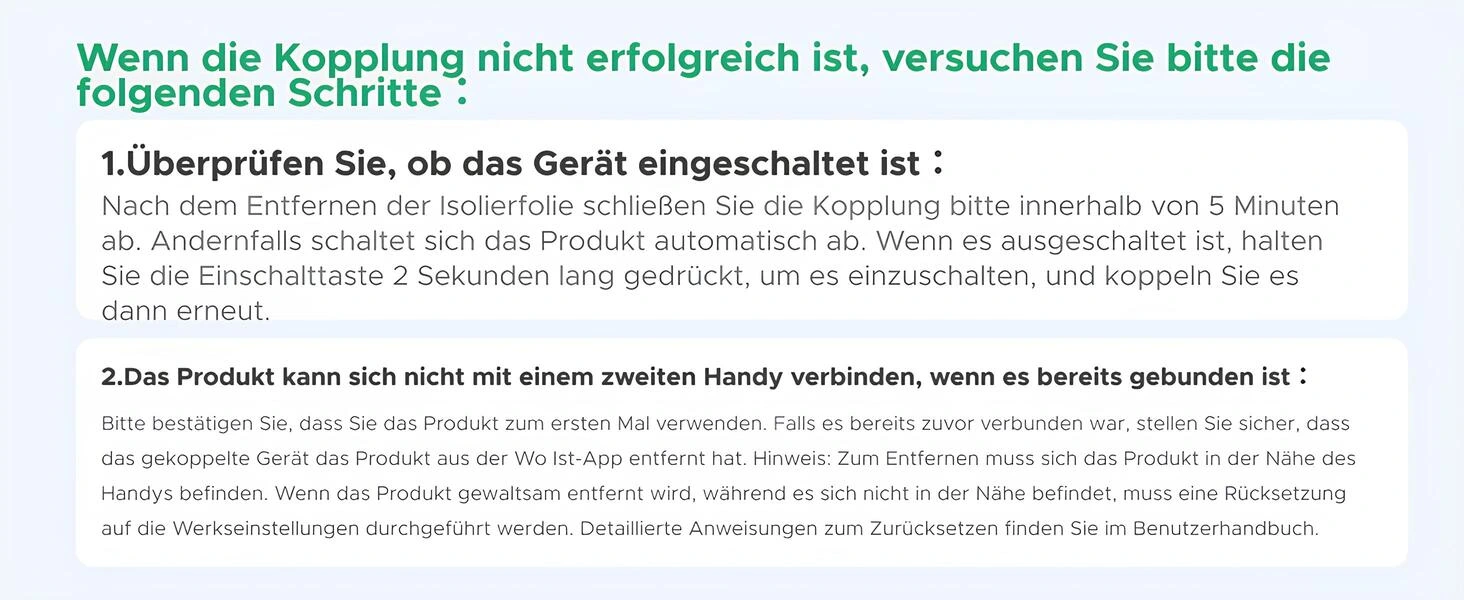 Eşleştirme başarısız olursa şu adımları deneyin: 1) Cihazın açık olduğundan emin olun. İzolasyon bandı çıkarıldıktan sonra eşleştirme 5 dakika içinde tamamlanmalıdır; aksi halde ürün otomatik kapanır. Kapalıysa güç tuşuna 2 saniye basarak yeniden açın ve tekrar eşleştirin. 2) Ürün daha önce bağlandıysa ikinci bir telefonla eşleşmez. İlk kullanım olduğundan emin olun. Daha önce bağlandıysa, eski cihazdan Find My uygulaması üzerinden kaldırılmış olmalıdır. Kaldırma işlemi sırasında ürün telefonun yakınında olmalıdır; uzakta zorla kaldırıldıysa fabrika ayarlarına sıfırlama gerekir. Ayrıntılı sıfırlama adımları kullanım kılavuzundadır.