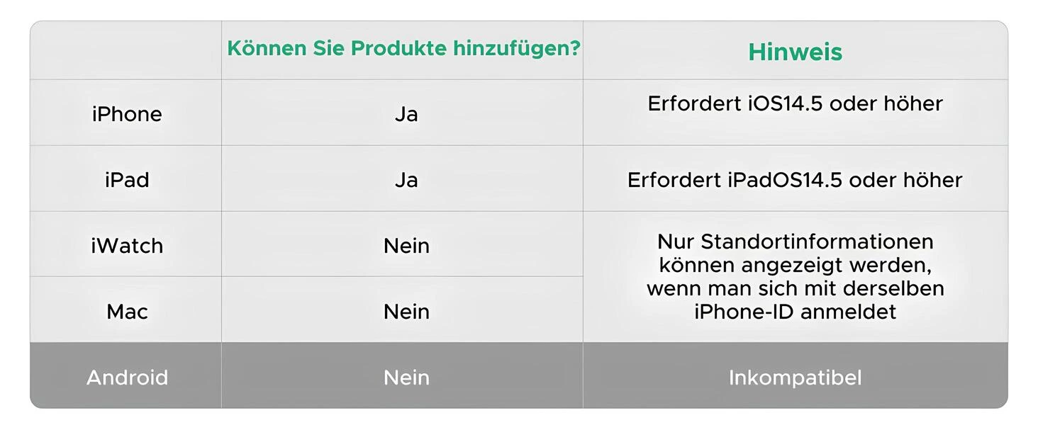 iPhone: Ürün eklenebilir · iOS 14.5 ve üzeri gerekir. iPad: Ürün eklenebilir · iPadOS 14.5 ve üzeri gerekir. iWatch: Ürün eklenemez · Aynı iPhone hesabı ile yalnızca konum bilgisi görüntülenir. Mac: Ürün eklenemez. Android: Desteklenmez, uyumsuzdur.