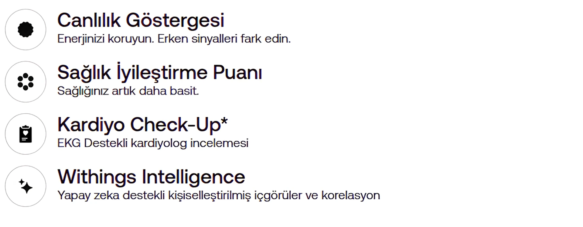 *EKG özelliği olan tüm Withings veya harici cihazlarla uyumludur. Kanada’daki Withings cihazları EKG kaydı yapamaz. Cardio Check-Up, Avrupa ve ABD’de doğrudan Withings Uygulamanız üzerinden kullanılabilir ve bir Withings+ aboneliği gerektirir. Diğer ülkelerde daha sonra kullanıma sunulacaktır.