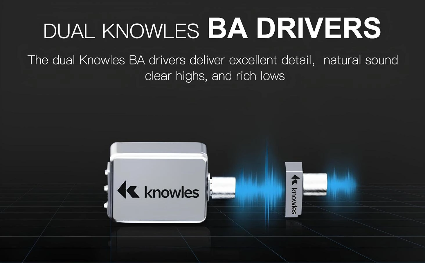 - BA Çift Knowles Sürücüleri: Her kulaklıkta iki adet yüksek çözünürlüklü Knowles sürücüsü, her kulaklıkta ayrı bir woofer ve tweeter sayesinde tüm frekans spektrumunda zengin ve ayrıntılı ses.